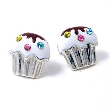 Pair of cute 1/2" flat silver plated cupcake earrings with crystals; post backs.Lead and nickel safe. Comes gift boxed. More Detail..