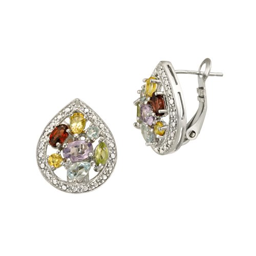 Colorful gemstones unite with the Sterling Silver Diamond-Accented and Multi-Gemstone Teardrop Clutchless Earrings. A cluster of amethyst, garnet, blue topaz and peridot stones in different shapes and sizes fill the center of a classy teardrop-shape earring. Each teardrop-shaped earring is outlined by natural white diamonds which add additional sparkle to the clutchless-back style earring. The great thing about multi-gemstone jewelry is that it can be paired with a variety of other gemstone accessories and will become a favorite piece in her jewelry box.