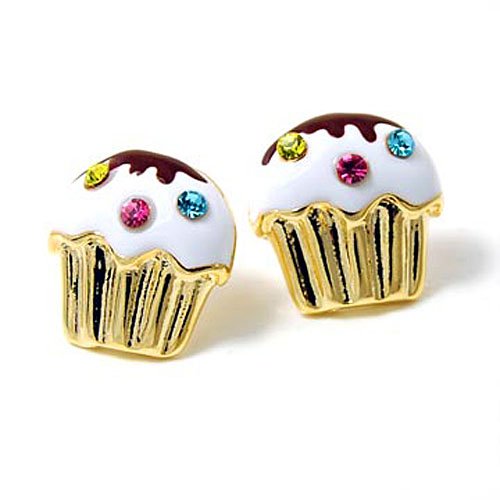 Here is a cute pair of flat gold plated cupcake stud earrings. They have white and chocolate frosting sprinkled with blue, pink, and yellow crystals on top. Great for yourself or for gift giving. Remember, your earrings will come to you in a foil gift More Detail..