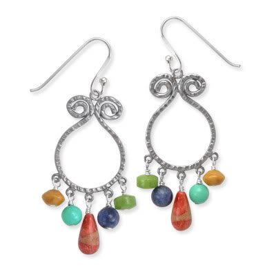 These cute earrings are made with a patterned silver for an antique look. The 5 stones (yellow jade, turquoise, red jasper, lapis & green jade) dangle for a colorful "pop". An Element Jewelry gift box is included with this purchase. Read More....925 Silver & Multi-Stone Chandelier Earrings Technical Details